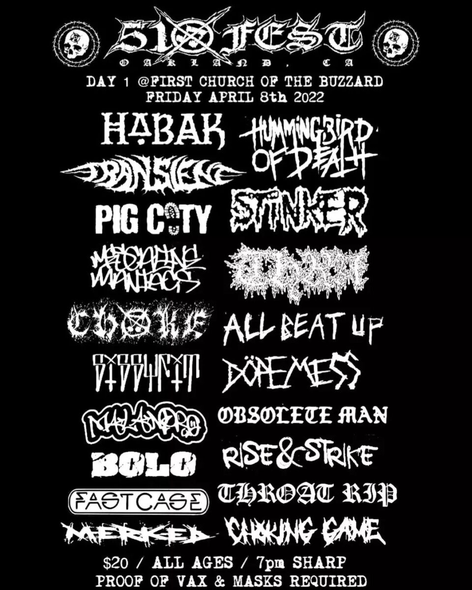 with Domestic Immunity, Merked, Fastcase, Choking Game, Malandro, Bolo, Dopemess, Rise And Strike, Obsolete Man, Sissyfit, Choke, All Beat Up, HOD, Thra (AZ), Pig City (AZ), Habak (MX), and Transient (OR)